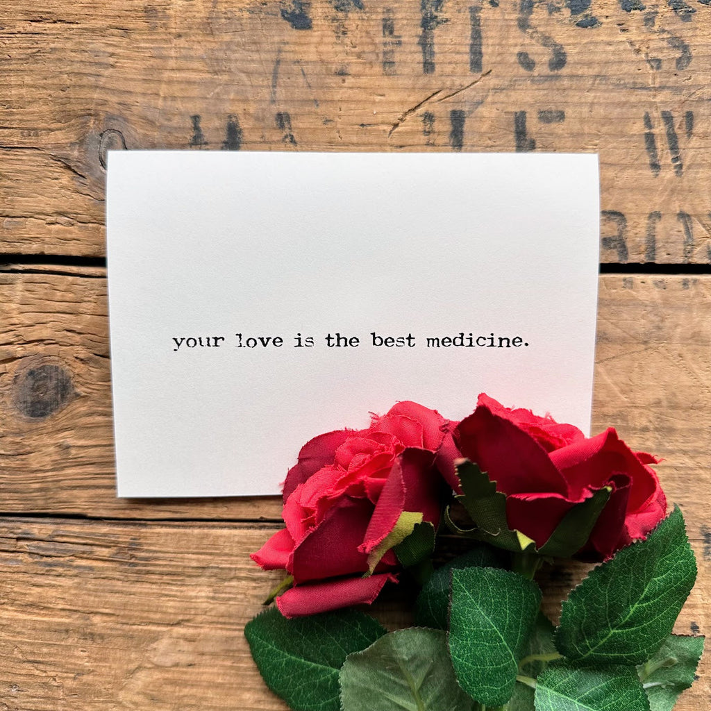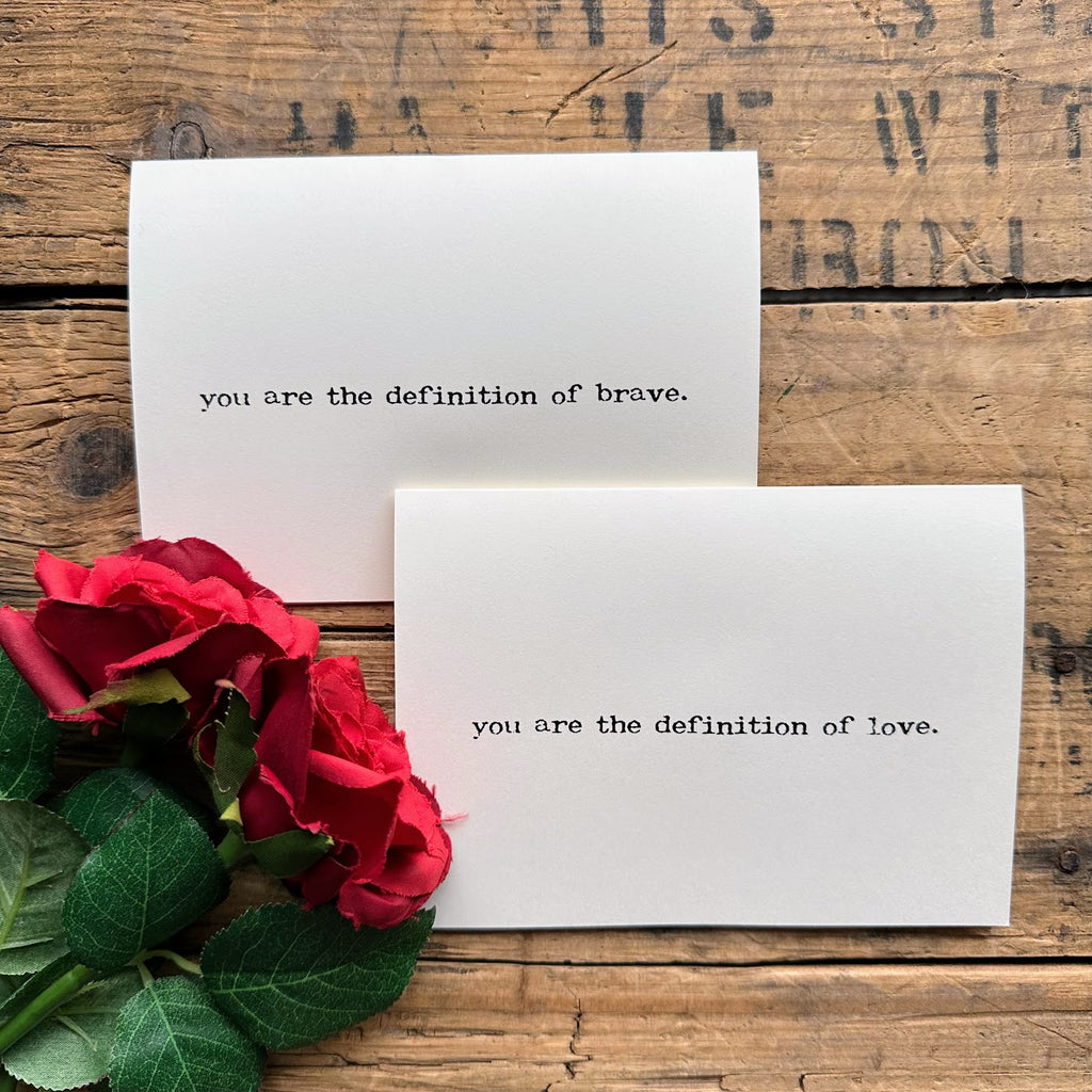 The words are printed in typewriter font on your choice of Kraft BROWN, WHITE, or IVORY cardstock. The kraft brown cardstock is not a flat brown, but has fiber mixed in. Size is 4" x 5.5". Corresponding envelopes are included. You will also receive a free Alison Rose Vintage sticker. Just peel the back off and seal your card with a red rose!