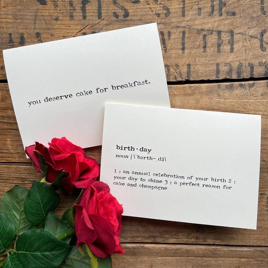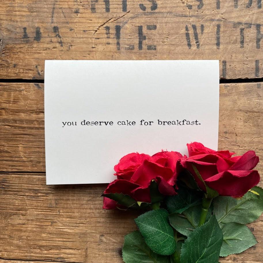 you deserve cake for breakfast compliment card in typewriter font with envelope and rose sticker.