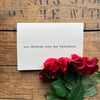 The words are printed in typewriter font on your choice of Kraft BROWN, WHITE, or IVORY cardstock. The kraft brown cardstock is not a flat brown, but has fiber mixed in. Size is 4" x 5.5". Corresponding envelopes are included. You will also receive a free Alison Rose Vintage sticker. Just peel the back off and seal your card with a red rose!