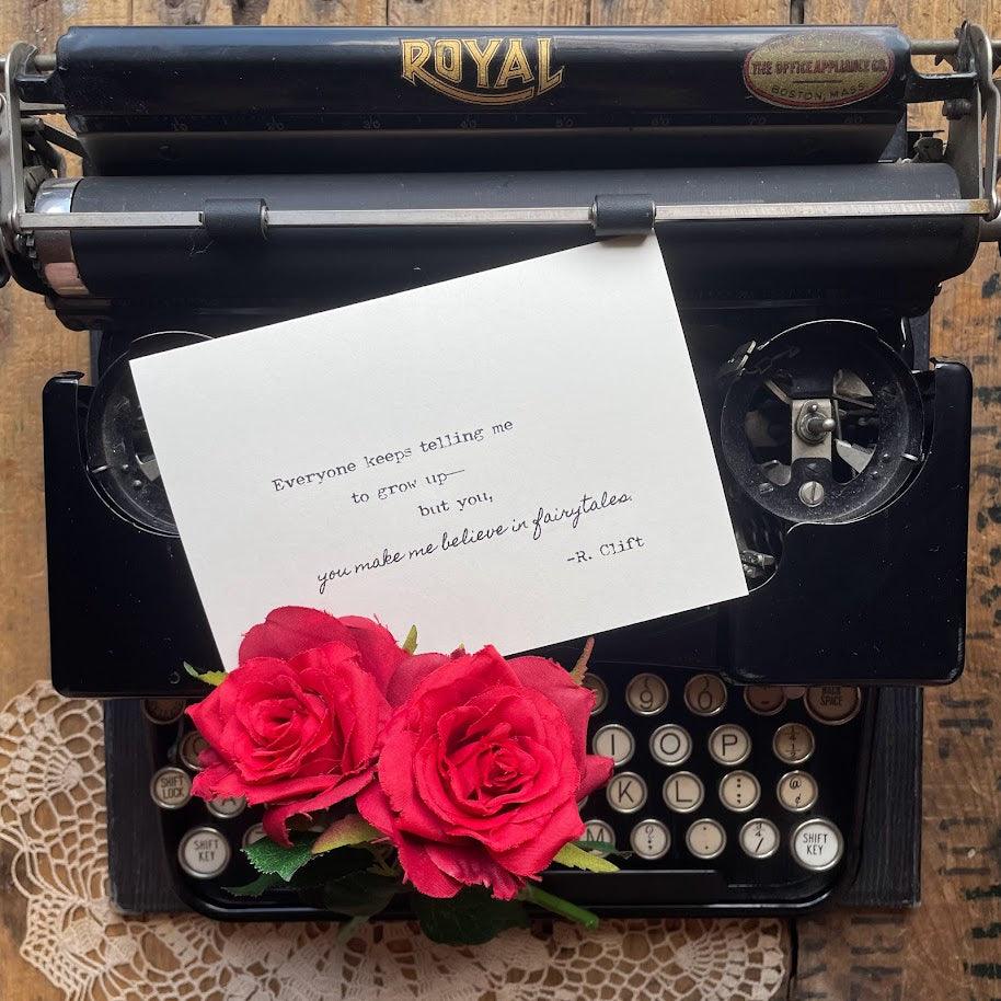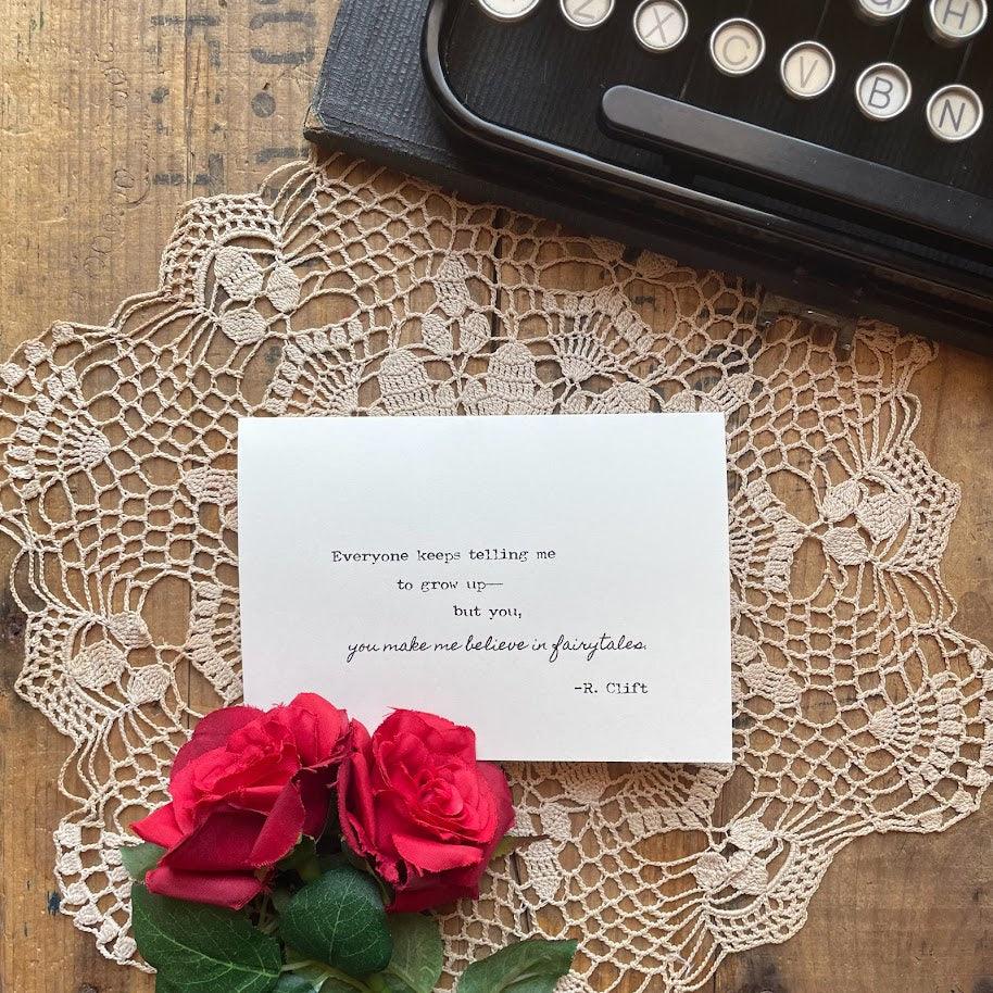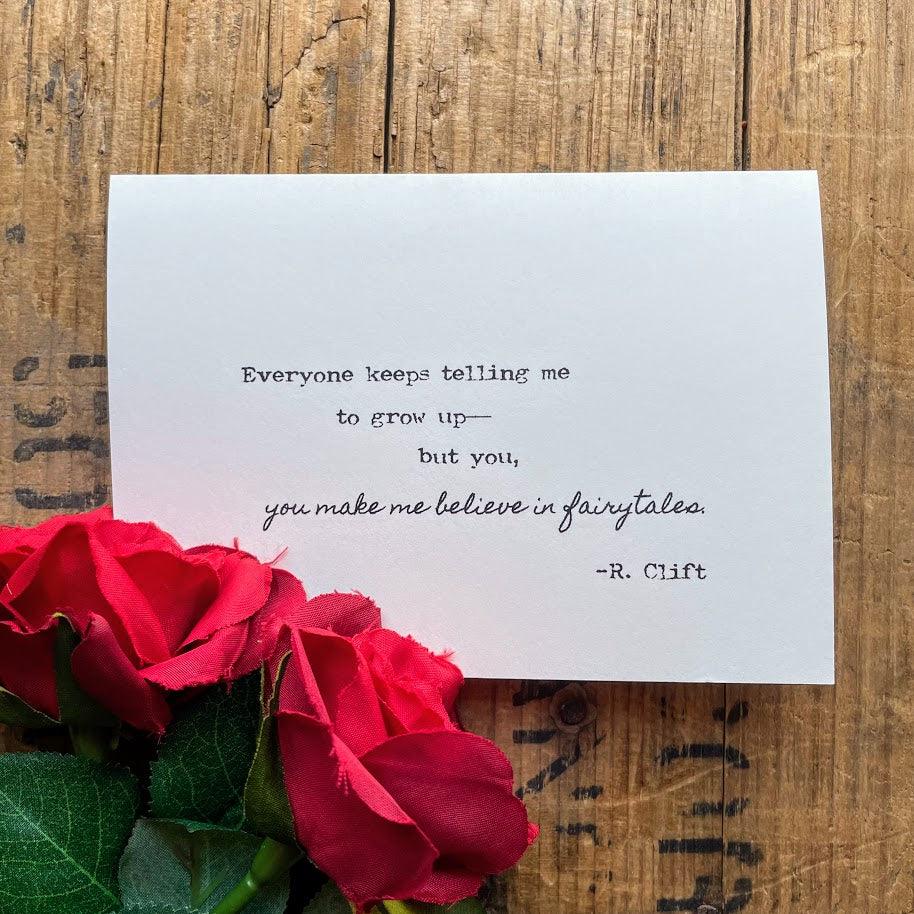 "Everyone keeps telling me to grow up—but you, you make me believe in fairytales." quote by R. Clift made into a greeting card.